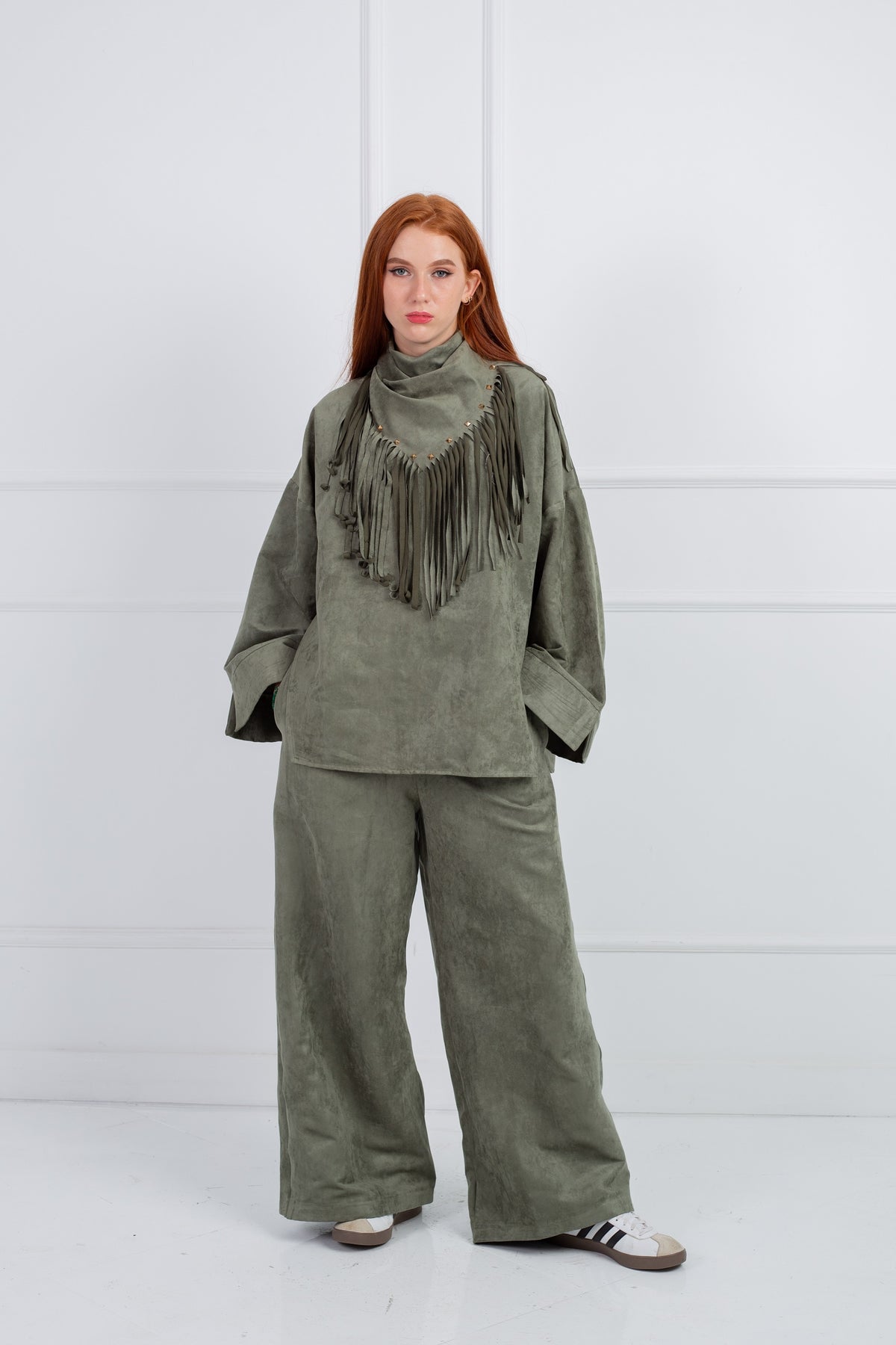 The Loosely Fit Set, made from soft suede fabric, features a fresh design with tassels at the neckline. Its relaxed fit and stylish detailing offer both comfort and elegance for a unique, chic look.
